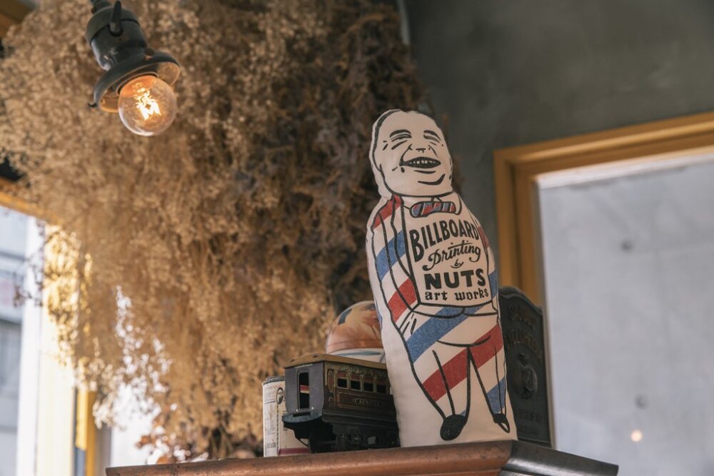 NUTS ART WORKSの作品はサロンの至る所に見ることができる。1920年代のアメリカ禁酒法時代の雰囲気をうまく表現しており、この作風は比内氏ならでは。内装などの仕事でタッグを組むこと多いのだとか。Instagram@nutsartworks