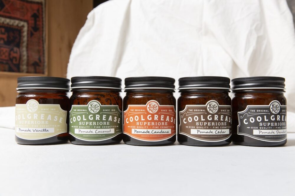 阪本高生堂のフラッグシップモデル、COOL GREASE SUPERIOREは長尾氏が開発に携わる。パッケージデザインはNUTS ART WORKS。220g。各2200円