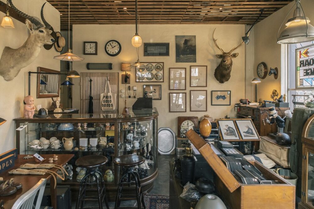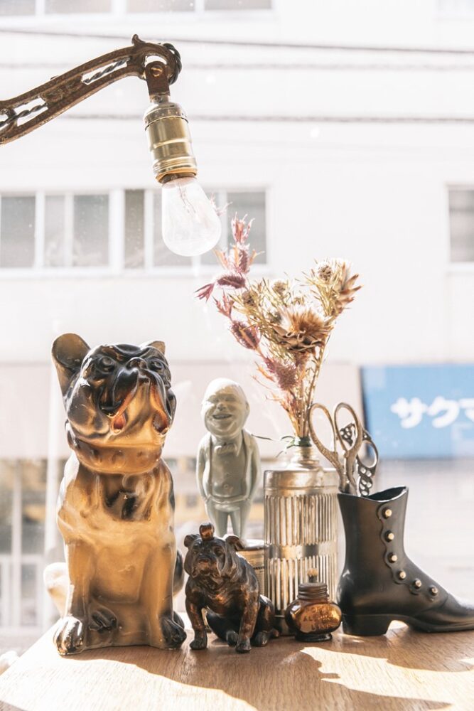 取材日は不在だったが、看板犬であるフレンチブルドッグのナティーがいることもあって、ブルドッグモチーフのアンティークが随所に置かれている。コツコツと収集したそう。