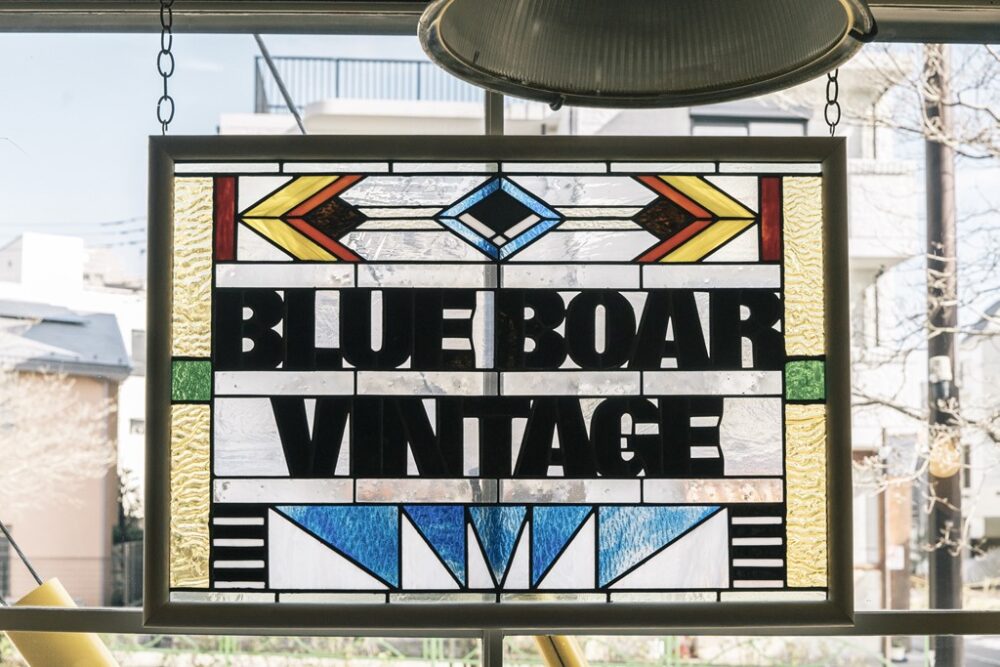 恵比寿にあるヴィンテージ家具店のBLUE BOAR VINTAGEの看板も長尾氏が手掛けたもの。タイルだけでなくステンドグラスも得意とする。Instagram@blueboarvintage