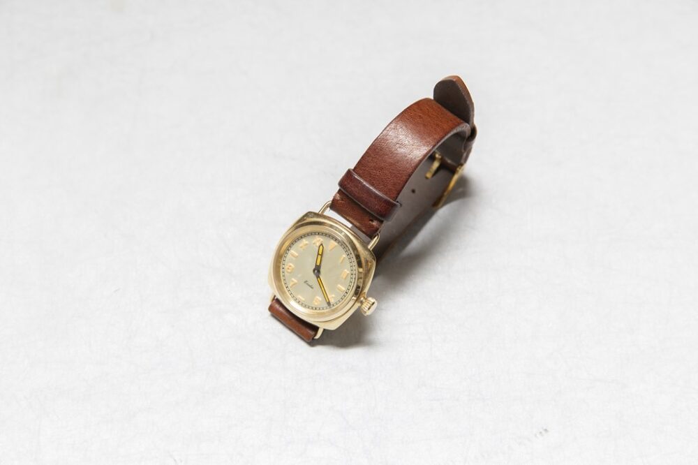 クラシカルなペンシルハンドの時計はOLD JOE製。小振りなサイジングなので、仕事でも頻繁に着ているシャツと相性抜群。ユニークダイアルと呼ばれる文字盤も◎。