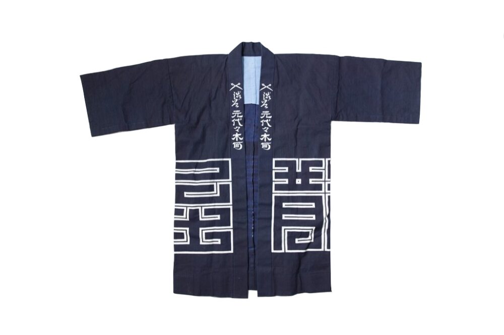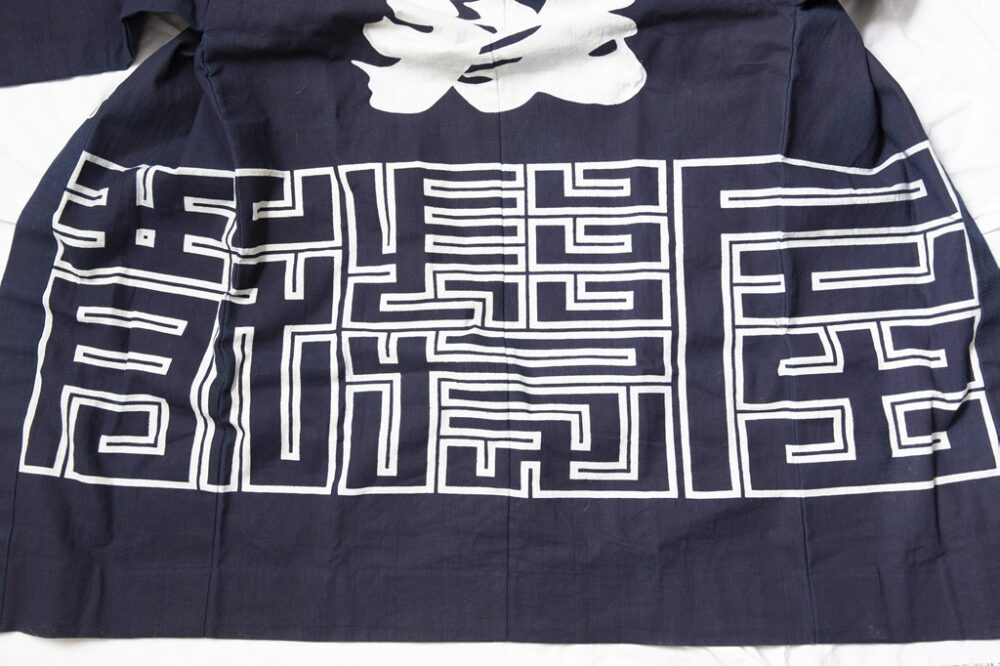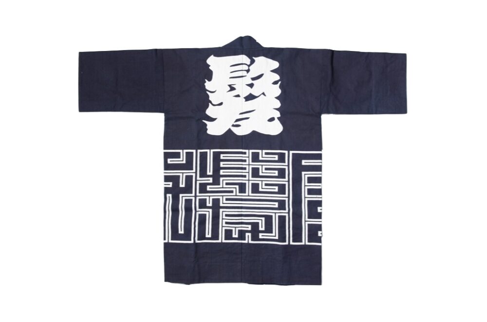 NUTS ART WORKSの薦めでオーダーしたという紺仁染織工房の半纏。デザインは比内氏が担当し、幾何学模様は散髪屋の文字がモチーフ。作業着として着用するという。