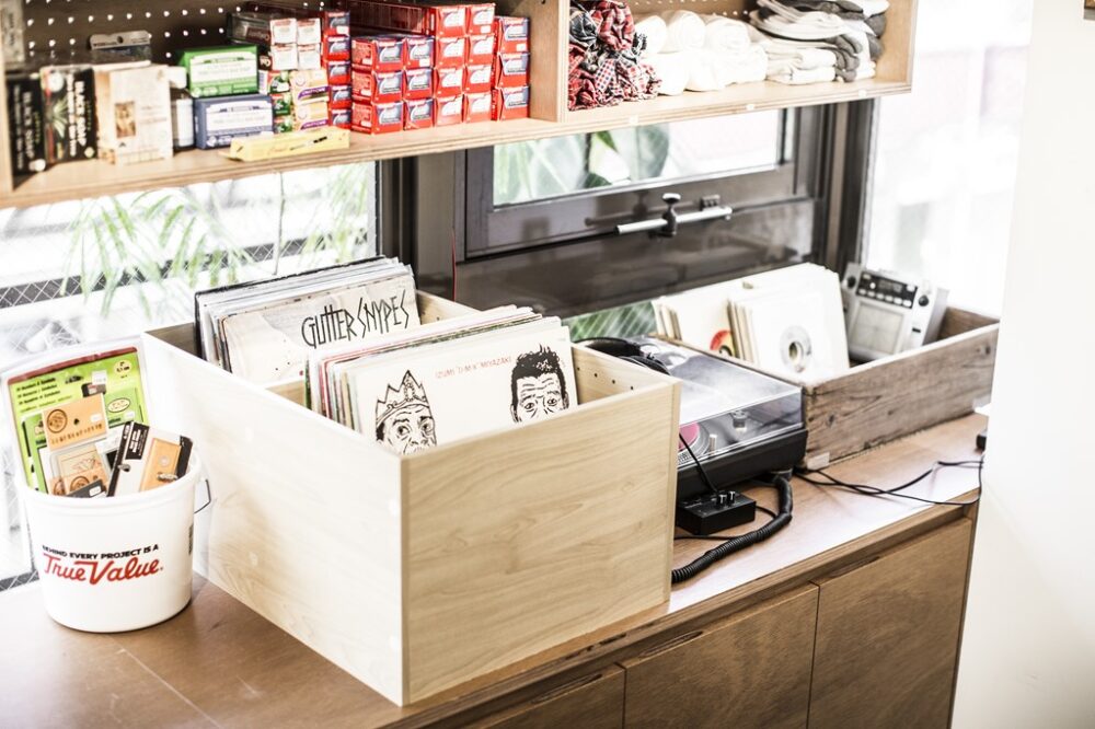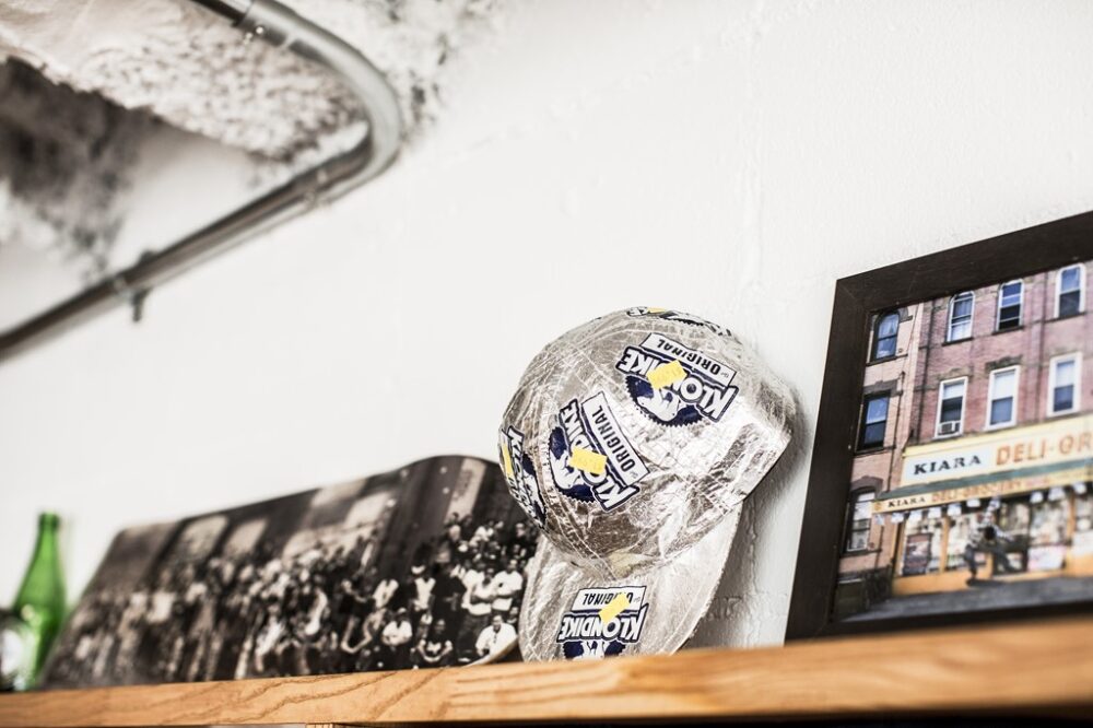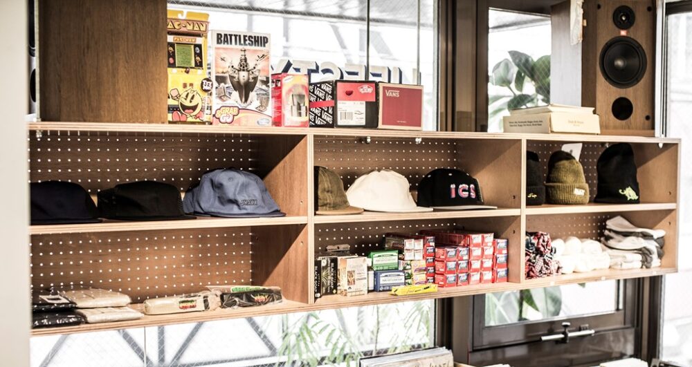 店内の棚にはお気に入りのアートピースが飾られる。中央のキャップはアイスキャンディの包装紙で製作。NYのスケーター・Brian DowneyによるFALCON BOWSEの作品だ。