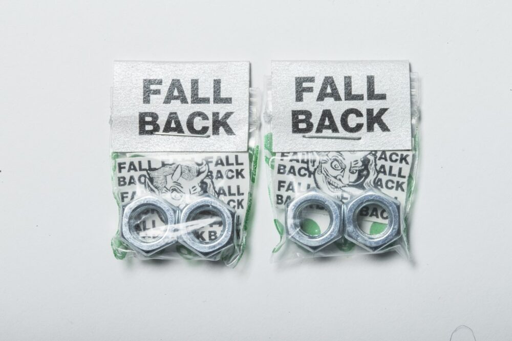 FALLBACK HARDWAREのアクセルナット。SFを拠点に活動するFALLBACKは森下氏と旧くからの付き合いで、いわく「センスの塊」。ステッカーデザインもクール。