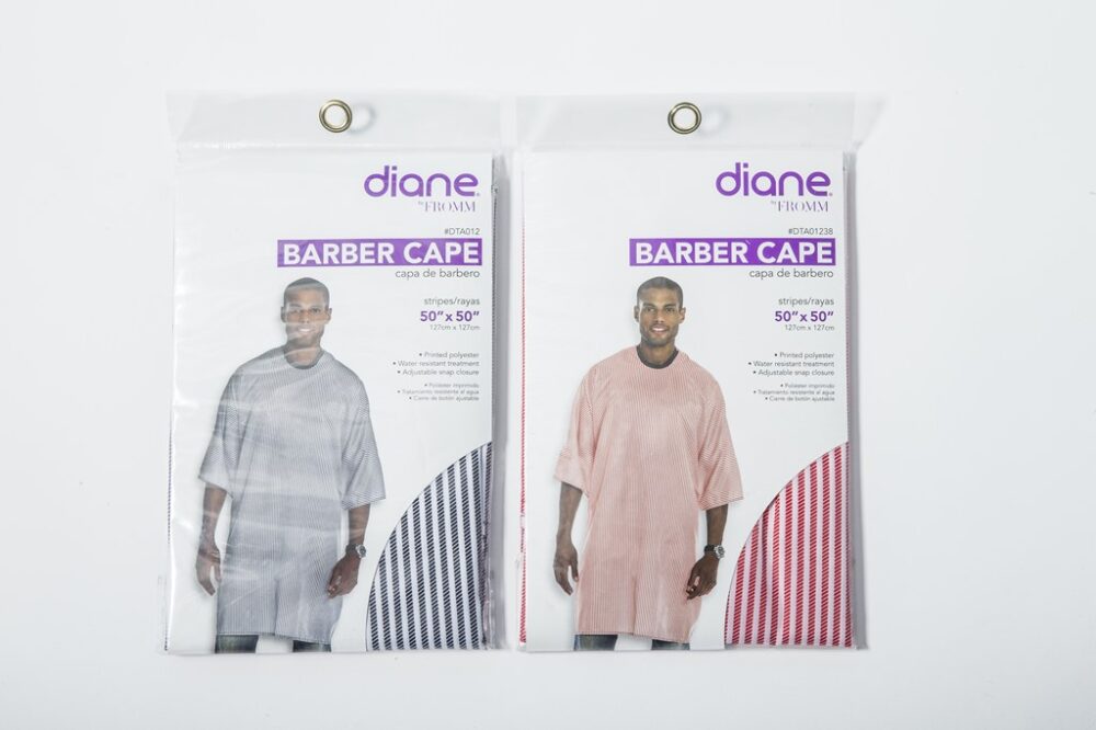 こちらもアメリカ仕入れ。DIANEのバーバーケープはバリカンとセットで揃えておきたい。首元がトリムデザインで、2種類のストライプカラー。127×127cmサイズの防水生地。