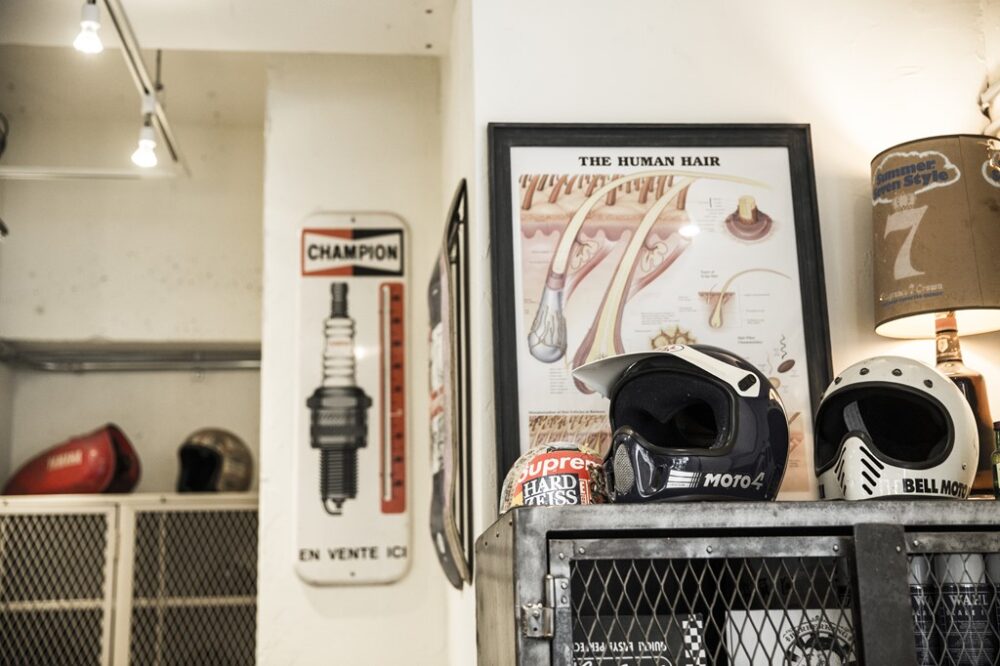 バーバーの店内には鉄製の大型シェルフが置かれ、壁面にはバイクに関連したヴィンテージのサインボードや希少なヘルメットなど、オーナーの私物がオブジェとして飾られている。