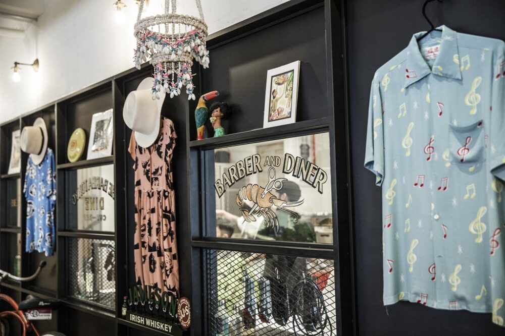 ガラスにはダイナーならではのシュリンプにハサミが刺さったイラストがハンドペイントで描かれている。散髪ついでにランチも堪能できる。