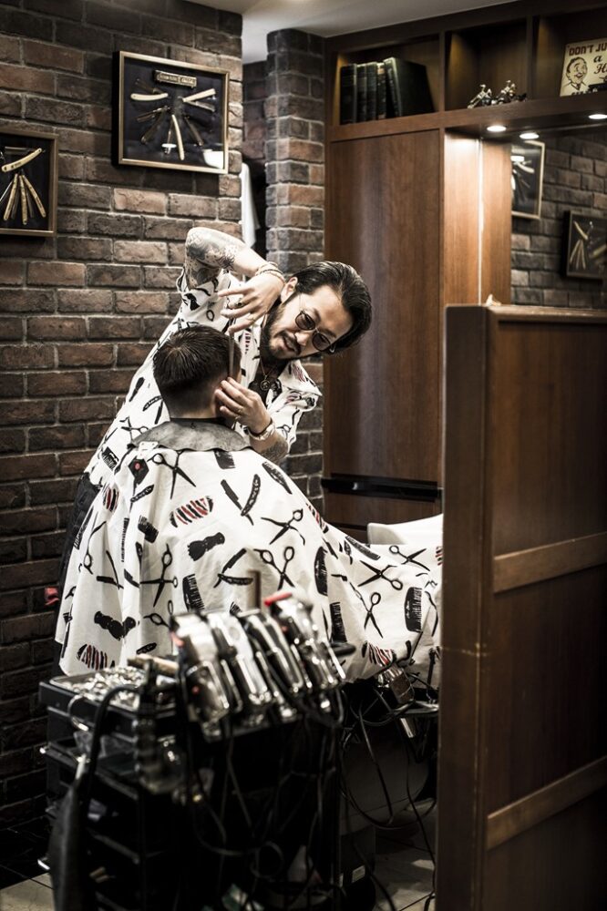 そんな彼が営むショップは、オールドアメリカンスタイルのバーバー。店内はアンティーク家具を基調とした落ち着きのある大人の空間へと仕上がっている。連日予約が埋まるほど人気店であるTHE BARBA TOKYOは、有名スポーツ選手を含め、著名人も多く通うことでも知られている。