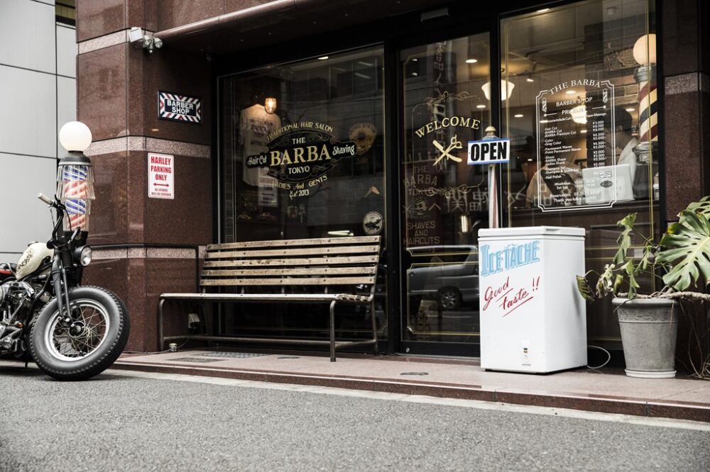 オフィス街で知られる東京・神田に位置するTHE BARBA TOKYO。昔ながらのバーバーポールとTOM氏の愛馬であるショベルヘッドがショップの目印となっている。