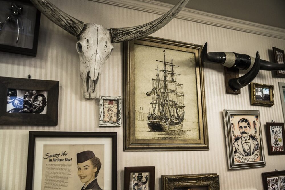 壁面にはアンティークのアートやバッファローホーンなどのオブジェが一面に飾られる。オールドアメリカンな空間を創り上げるアートピースとなっている。
