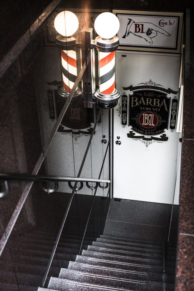 THE BARBA TOKYOのすぐ真裏に2号店としてオープンした「THE BARBA TOKYO B1」。地下へと降りる階段が、知られたくない隠れ家のようで男ゴコロをくすぐる。