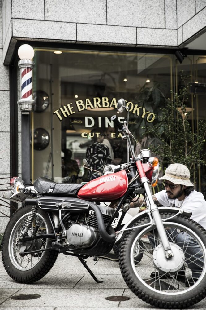 バーバーで飾られるヴィンテージバイクは単なるオブジェとして置かれているのではなく、すべて実働車。オフロード車の名車として知られるYAMAHA DT1Fは真っ赤なタンクがひと際目立つ。