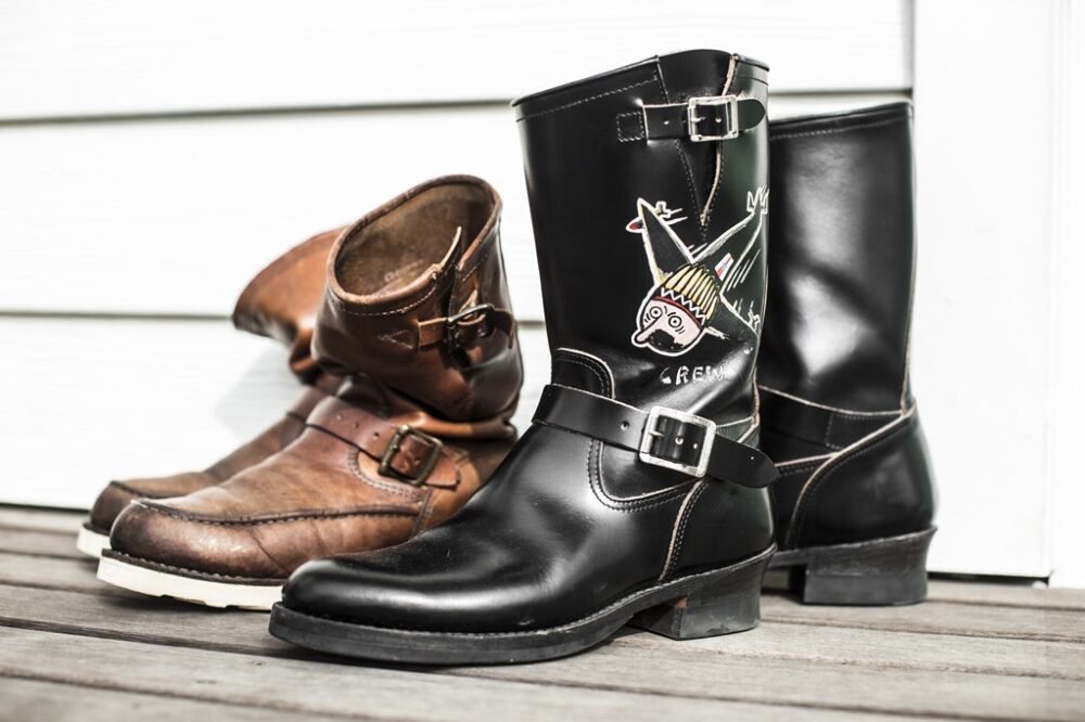 BILTBUCKのエンジニアブーツは美しいフォルムとNORTH NO NAMEの堀川氏によるハンドペイントがお気に入り。Chippewaのモックブーツはソール交換をしながら10年愛用している。