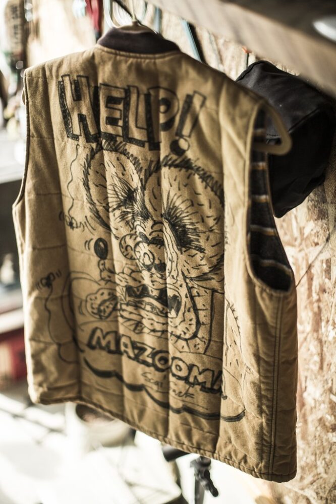 ガレージの壁に吊るされたベストの背面にはハンドペイントで描かれたラットフィンクのイラスト。日本を代表するペインターとして知られるSUGISACK氏が手掛けたもの。