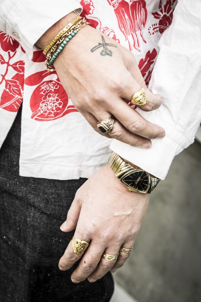 Hamiltonのベンチュラを筆頭に、リングやブレスレットなどゴールドで統一されたアクセサリー類。「普段から身につけるアクセサリーは昔からゴールドが好きなんです」