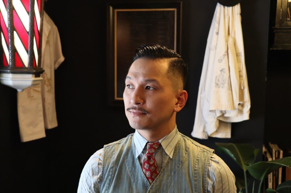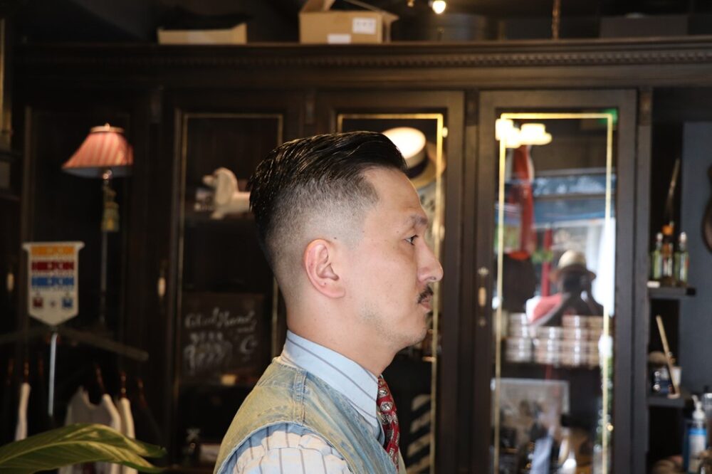 もっとも得意とするフェードカットは、顔の形や髪質、キャラクターなどで微妙に調整しているため、十人十色の仕上がりとなる。このスタイリングは、フェードの位置を高くし、よりクラシックな雰囲気にするため、短く刈り上げている。トップを短めにすることでより端正な印象となった。