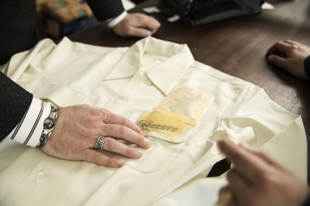 曽原氏が購入したオリジナルのオープンカラーシャツに、その場でヴィンテージのアイロンプリントを施してくれた。こういったオーダーメイド感覚がたまらないと太鼓判を押す。