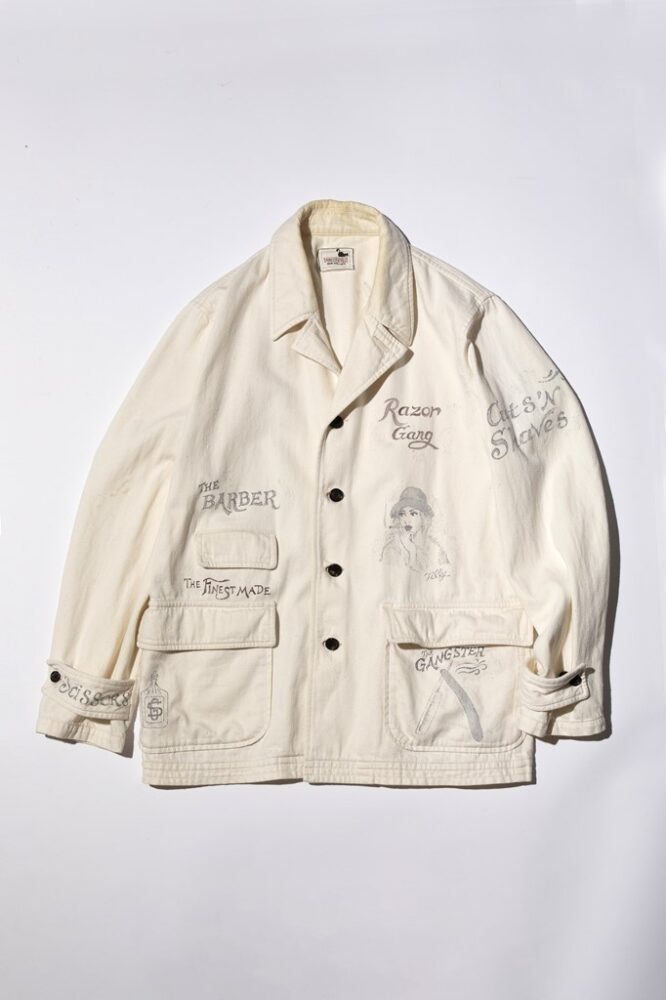 ギャングスターヴィルのカバーオールに、専属絵師のL.氏がウルフマンバーバーのためにハンドペイントを施した1点もの。ショップにディスプレイされており、アートとしても成立するクオリティだ。