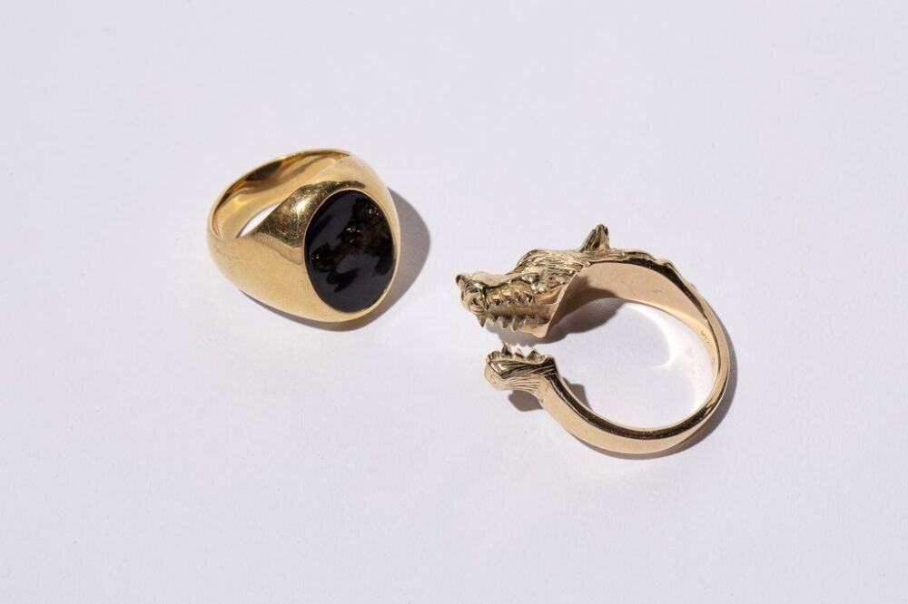 左はヴィンテージのティファニーで、センターにオニキスがセットされたシグネットリング。ボディは18金イエローゴールドである。右は結婚指輪として友人にワンオフで制作してもらったオリジナルリング。