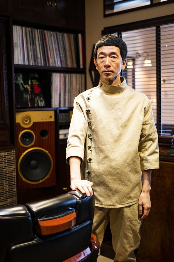 大好きなレコードが棚に並び。JBLのスピーカーから流れる音楽に浸ることができる贅沢な空間。非日常を味わうために、多くのファンがここを目指してやってくる。ちなみに10年を区切りに新展開もある。會田氏が着用するのは、「どうしても作りたくて」と米軍の将校などに支給されたウエポン生地で製作したケーシージャケット。10着限定ながら受注生産にも意欲的だ。
