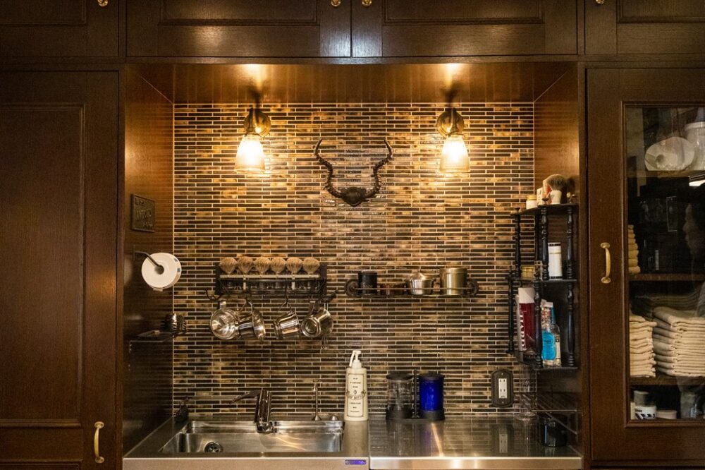 様々な種類から悩んで選び抜いたタイルはウッド基調の空間にマッチ。バッファローホーンのような重厚な鉄製ハットフックの下にはカミソリ倶楽部の高級シェービングブラシを配置。