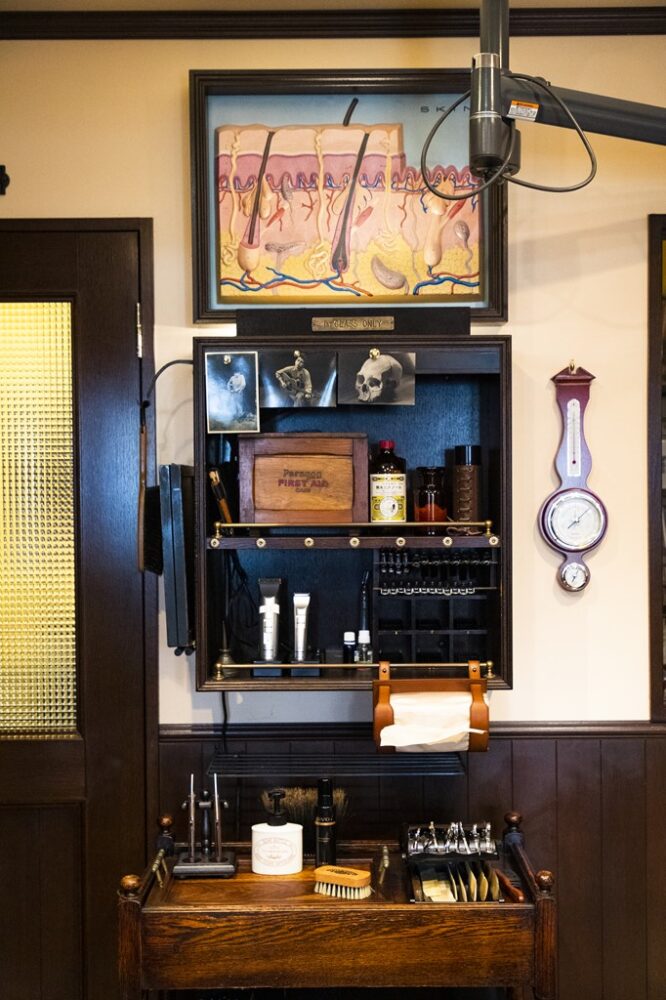 道具は職人の命。常に清潔さを保ち整理されている。棚の中にはアンティークの道具箱、棚の上には皮膚や毛根を立体デザインしたアートワーク。こんな遊び心も會田氏のセンスだ。