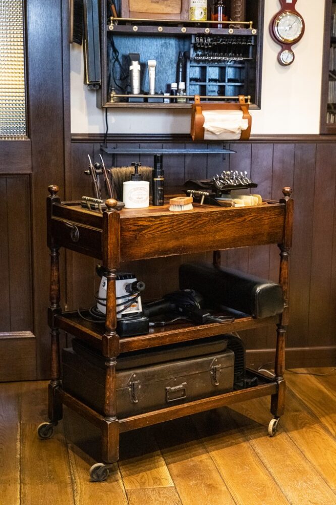 1920年代の英国製アンティークの化粧台を中央に設置したクラシカルなカットスペース。アンティークに彩られた内装は、細部に至るまで曾田氏の美意識が貫かれている。