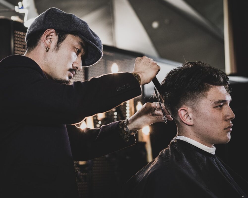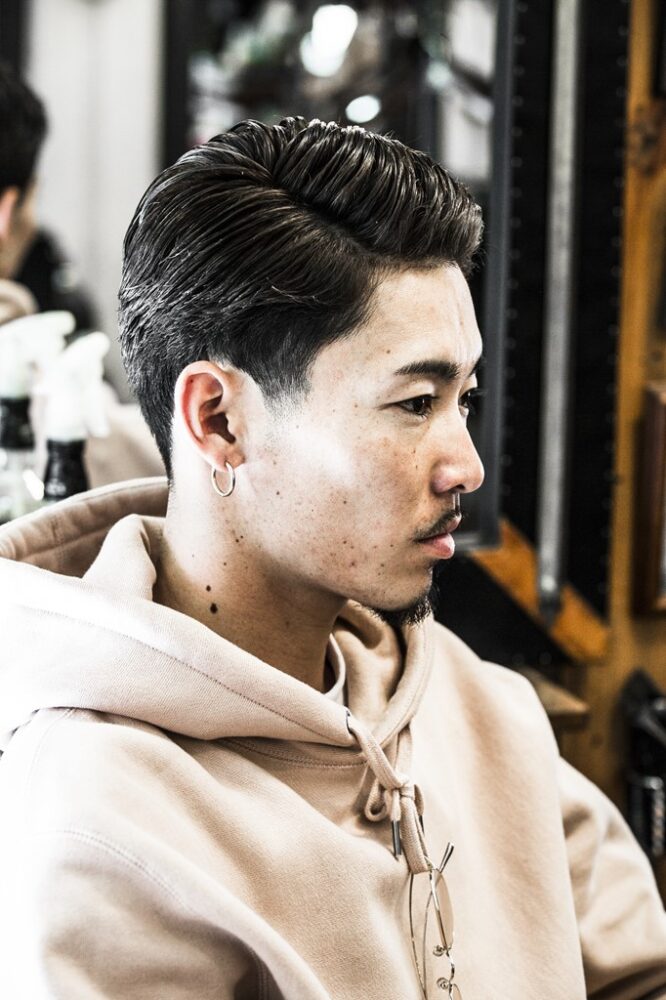柔らかい髪質のクセを活かしたトラディショナルなパートスタイル。トップを重めに残し、サイドとバックをもみ上げと襟足部分のみを刈り上げるテーパーに仕上げることで、落ち着いた雰囲気になるため、大人のビジネスマンなどにも人気があるスタイルだ。ポマードはオリジナルのBROSHを使用。