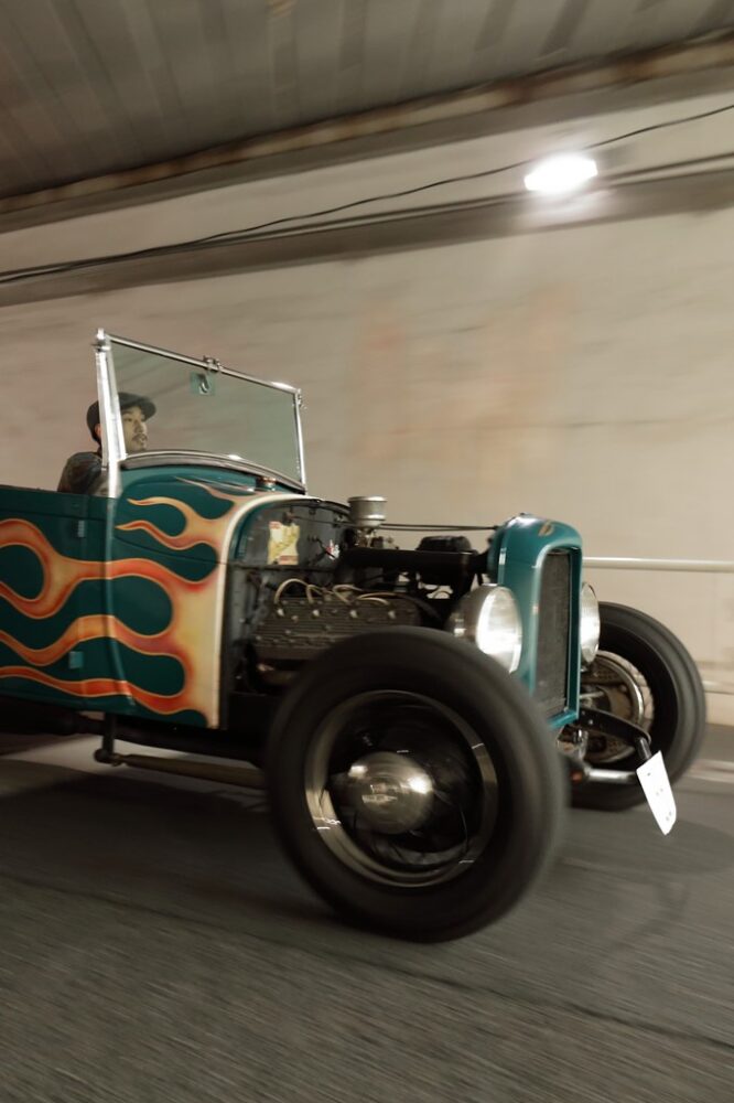 外装はフェンダーやフードを外して軽量化。グリルのピンストライプやグリ ーンのボディに映えるラフなフレイムスがお気に入りのディテールだという。
