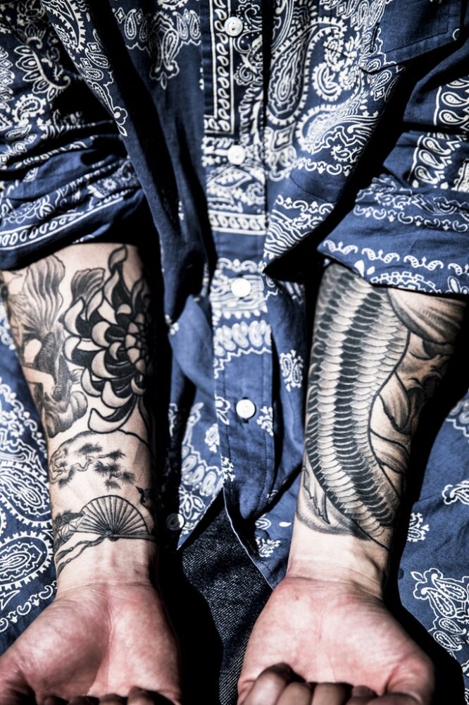 タトゥーはブラックアンドグレイで統一。和のモチーフを描いたタトゥーが多く、和洋折衷のデザインになっている。腕は全てMARSHALL TATTOOでいれたもの。