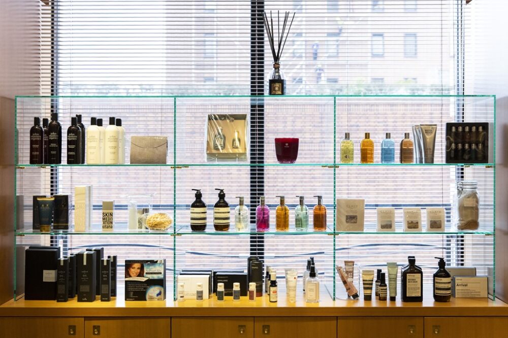 レセプションスペースは各種グルーミングアイテムも販売。MOLTON BROWN、AESOPのハンドソープやJOHN MASTERS ORGANICSのシャンプーのほかCLAYDの泥パックも揃う。