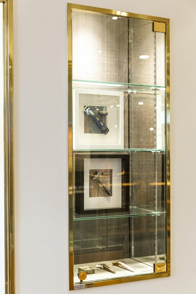 中段に飾られているのは、ヒゲ倶楽部のメンバーが集結した写真。サンドするようにその上下には、素材や柔らかさにこだわった上質なシェイビングブラシを配置している。