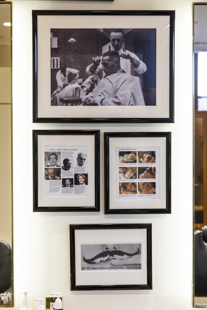 壁面を覆い尽くす、ランダムに飾られた額縁。収められているのは、バーバーにまつわる写真や広告ビジュアル。中には、1900年代前半の様子を伝えるものまである。