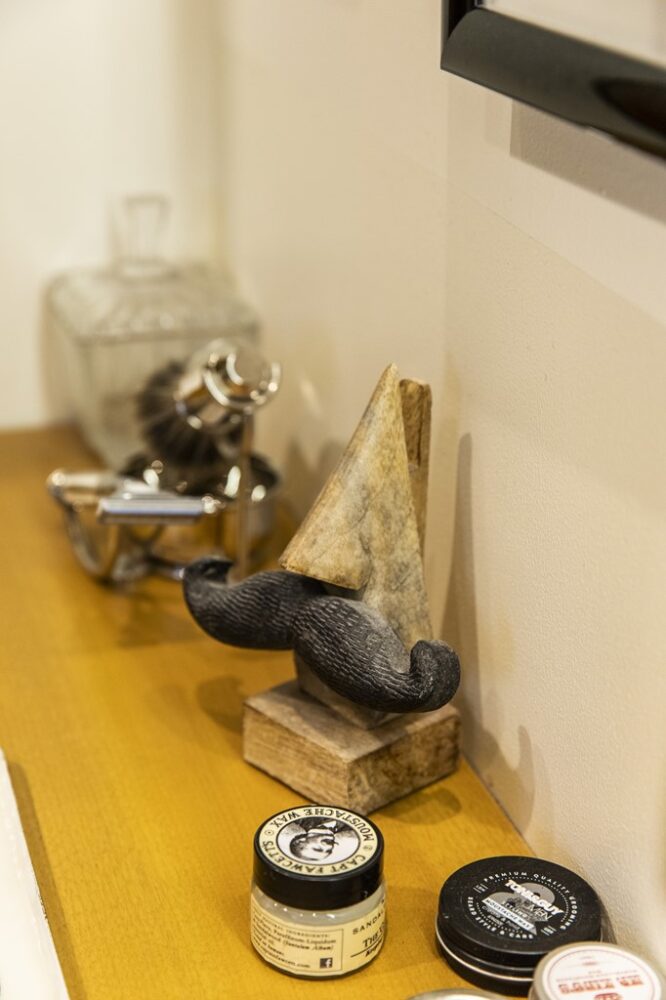 ヒゲ倶楽部のリーダーが籍を置くお店だけに、髭のデザインや提案力は同店の強み。それを暗に伝える、アーティスティックな髭のモニュメントが棚に鎮座する。