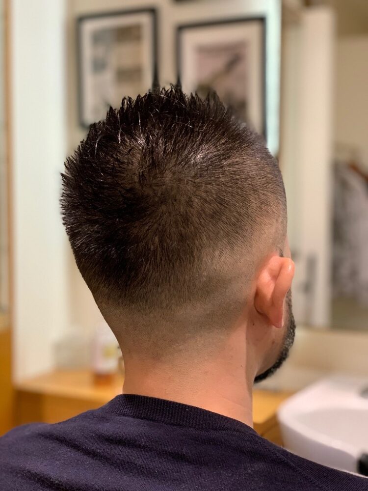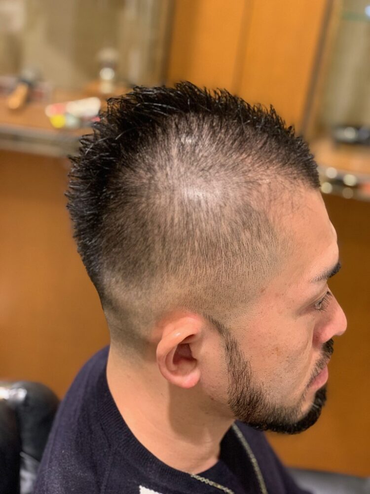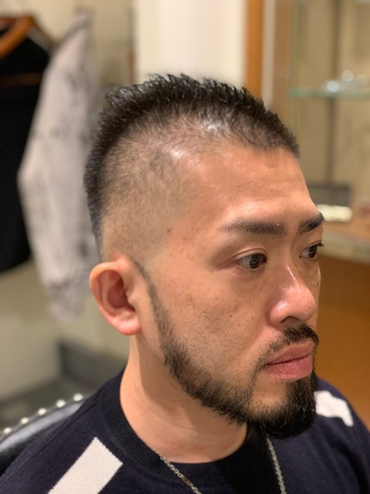 バズカットに近いベリーショート。サイドを大胆に刈り上げながら、程よく残しつつ後ろへ流したトップへ自然と繋がっていくように仕上げたハイフェードスタイル。髭は、鼻下は短めにカットしつつ唇下の髭同様、顎髭とジョイント。その顎髭をもみあげとつなげたエクステンドゴーティー型。