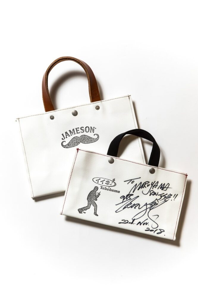 毎年参加するチャリティーで出会った横濱帆布鞄の社長と意気投合し、作ったのがJAMESONとのコラボバッグ。手前はラジオで共演した横山剣氏のサイン入り。