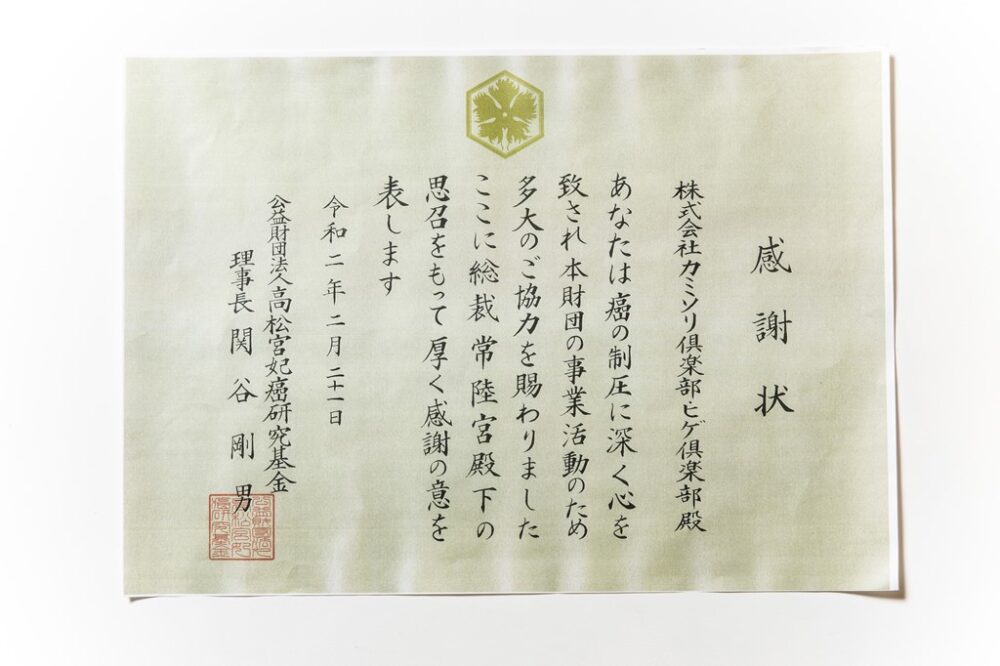 カミソリ倶楽部では、数年前から睾丸癌や膀胱癌のチャリティー活動を支援。寄付も行っている。その長年にわたる貢献が認められ、皇室より感謝状が贈られた。