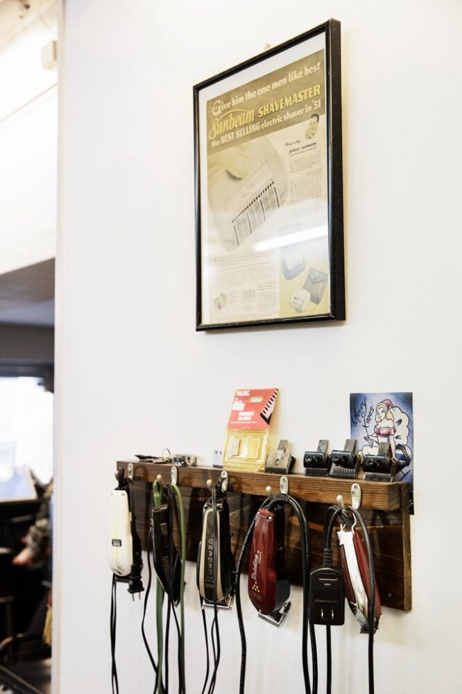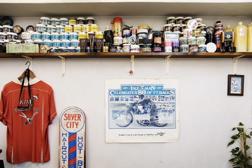 カットからシェービングまで行う正統派バーバー。壁面には様々なメーカーのポマードのパッケージなどがディスプレイされ、インテリアの一部になっている。
