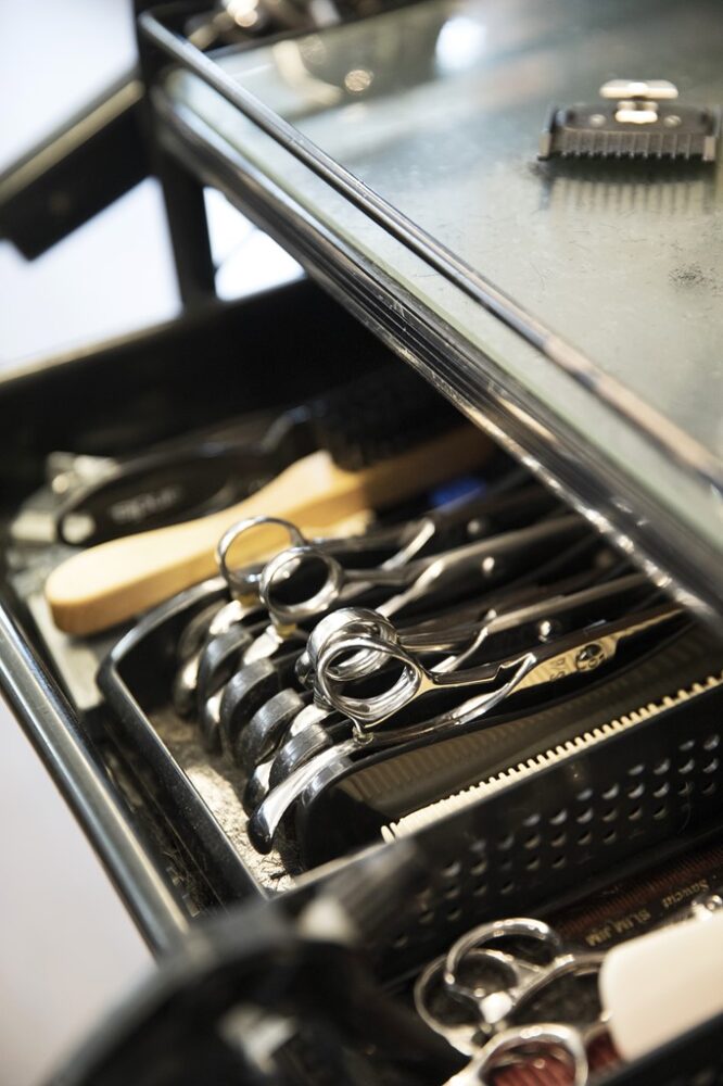バーバーキングは、オーナーの清水氏を筆頭に職人気質なスタッフが揃う。そのため、どんなに忙しい時でも、ハサミなど仕事道具が美しく収納されているのが好印象だ。
