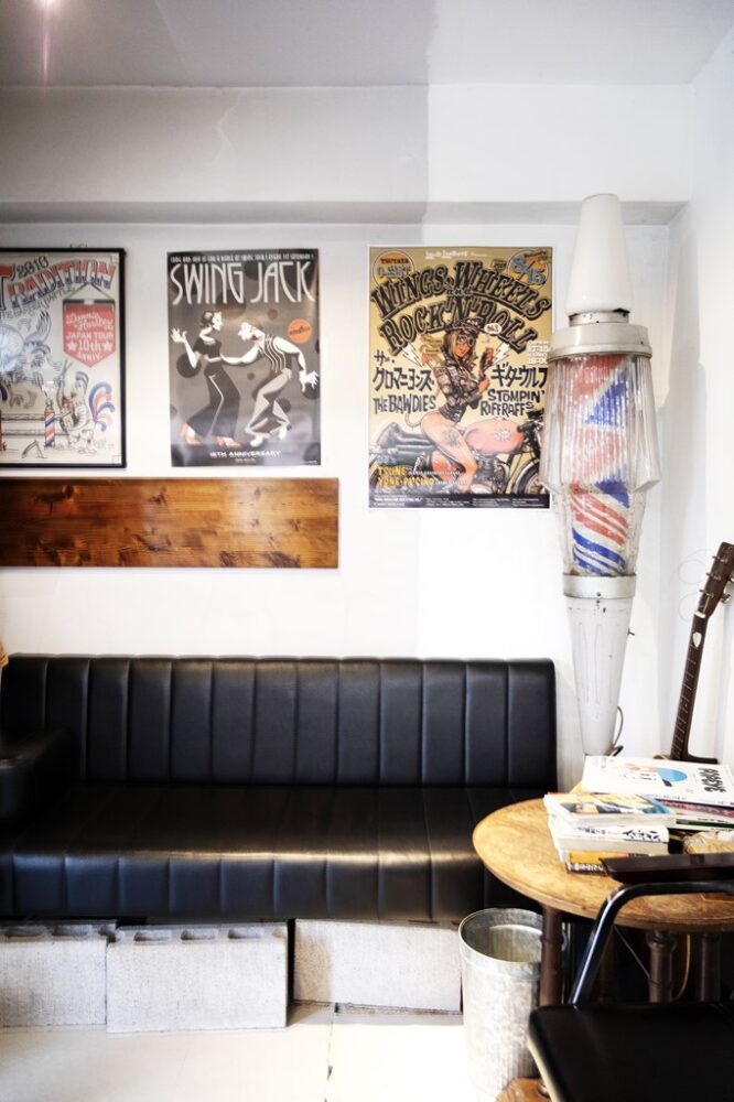 待合スペースには、親交の深いブランドのポスターなどが飾られている。ロックンロールなど、1950年代のアメリカンカルチャーにも影響を受けているのがわかる。