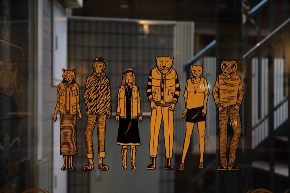 エントランスのウインドーにはハンドペイントでイラストが描かれる。様々なファッションに扮した男女の顔だけ動物の顔に入れ替わった可愛らしい作品。