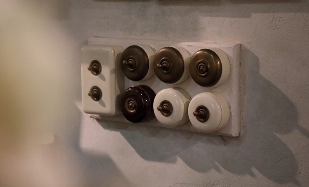 店内の照明器具類のスイッチは、壁面に付けられたヴィンテージのトグルスイッチでオンオフを操作する。見た目の良さはもちろん上下に動かす感覚が心地よく感じられる。