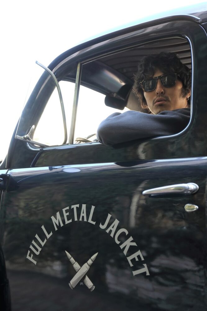 運転席側のドアには鈴木氏が営む会社の屋号であるFULL METAL JACKETの文字とロゴマークがハンドペイントされる。ボディカラーのネイビーと相性良し。