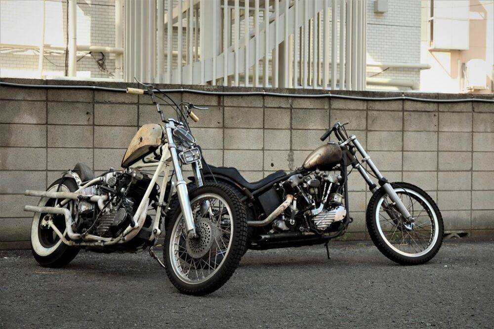 Harley-Davidsonのナックルヘッドは2台所有。かれこれ10年ほど乗っているという1946年製のFL(右)と1年ほど前に新たに購入したという1947年製のFL(左)。