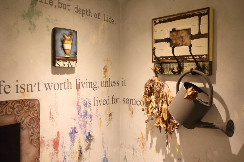 壁面にはアンティークの小物の他にイラストやペイントなど様々な手法でデコレーションされ、空間全体でアートを形成しながらも、どこか温かみのあるインテリアとなっている。