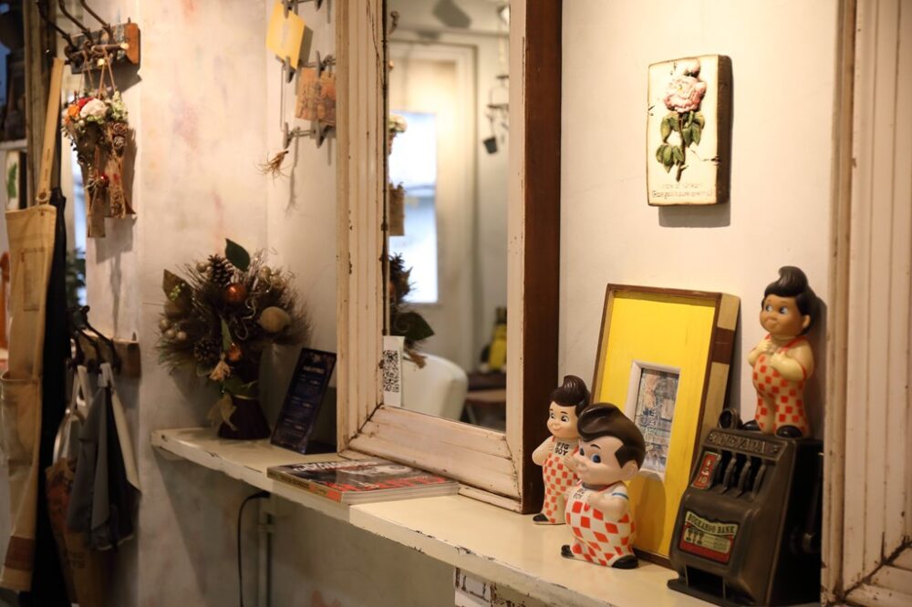 店内を彩るオブジェには、アンティークの什器の他にヴィンテージのドールやドライフラワーなど無造作に置かれている。その量もほどよく絶妙なバランスが保たれている。