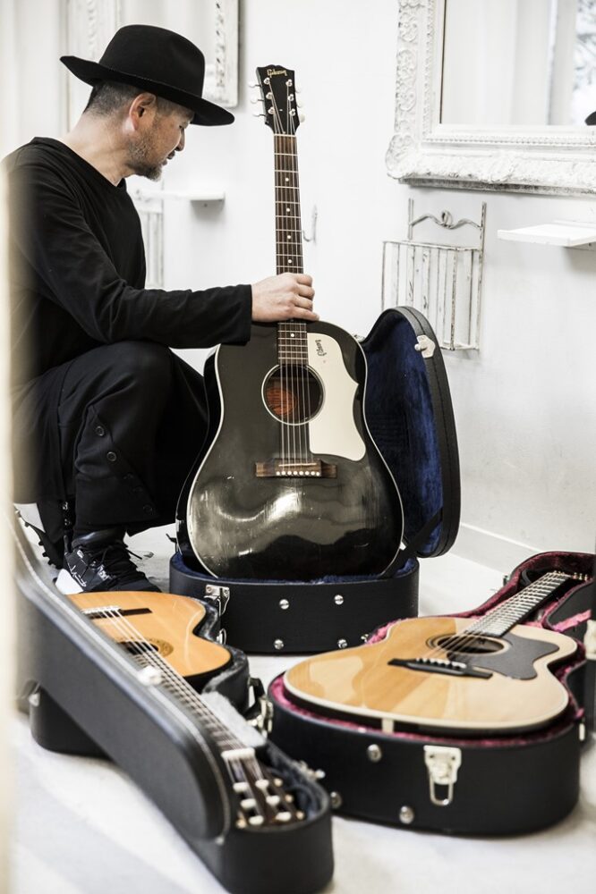 ギターも長年の趣味。なかでもGibsonのJ-45は20年以上も愛用している。+CHARMAN+の25周年イベントの際にバンドとして腕前を披露した。