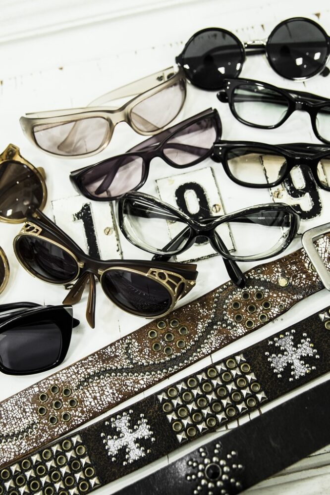 黒をベースとしたシンプルなウエアが多い円崎氏。コーディネイトのアクセントとなるサングラスやベルトなどの服飾小物は、特徴的なデザインのアイテムも多く所有する。