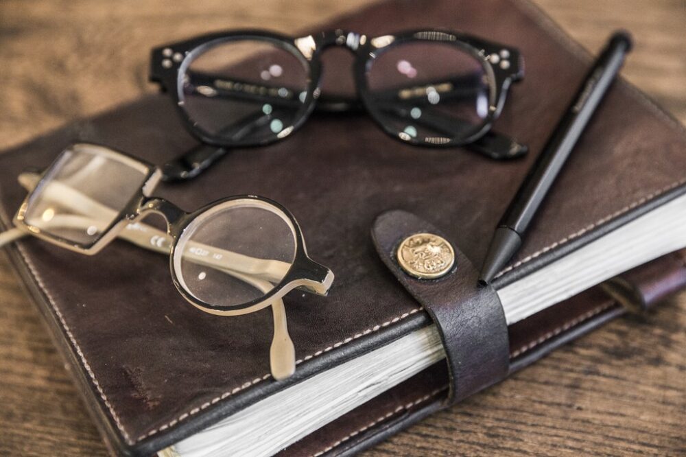 STURDYの革製カバーが付けられた予約ノート。ヴィンテージフレームのリーディンググラスも遊び心がある。