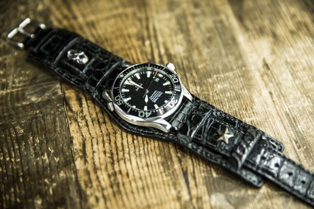 オメガ のシーマスターはshinya nomotoのレザー製のベルトでカスタムしている。